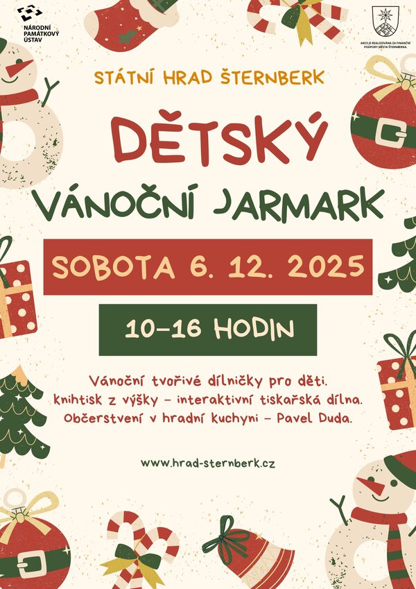 Oblíbenou adventní akcí na hradě Šternberk je tradiční DĚTSKÝ VÁNOČNÍ JARMARK, který se uskuteční v sobotu 6. 12. 2025. Začátek je naplánován na 10 a konec na 16 hodin.