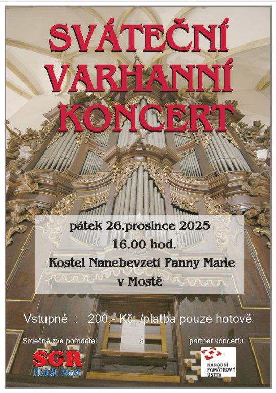 Tradiční vánoční varhanní koncert, konaný  v kostele Nanebevzetí Panny Marie v Mostě, pořádá Drahoslav Rieger.   Vstupenky bude možné zakoupit v pokladně kostela dne 26. 12. 2025 od 15:00 - platba pouze v hotovosti.