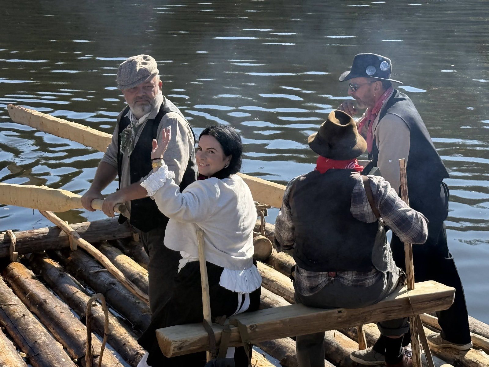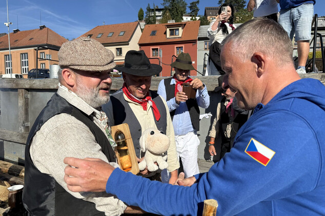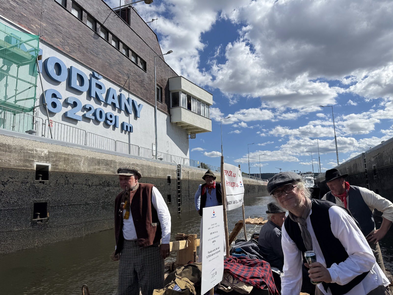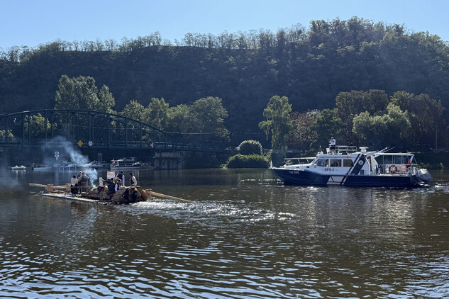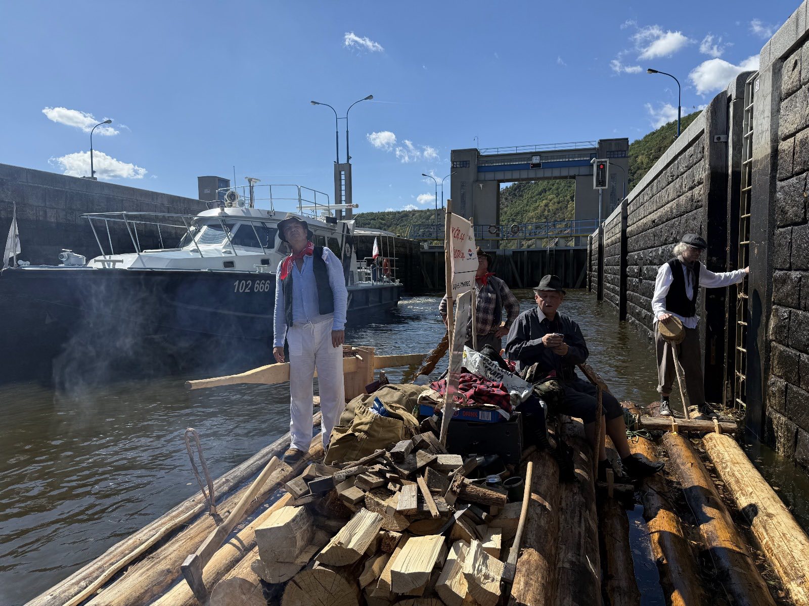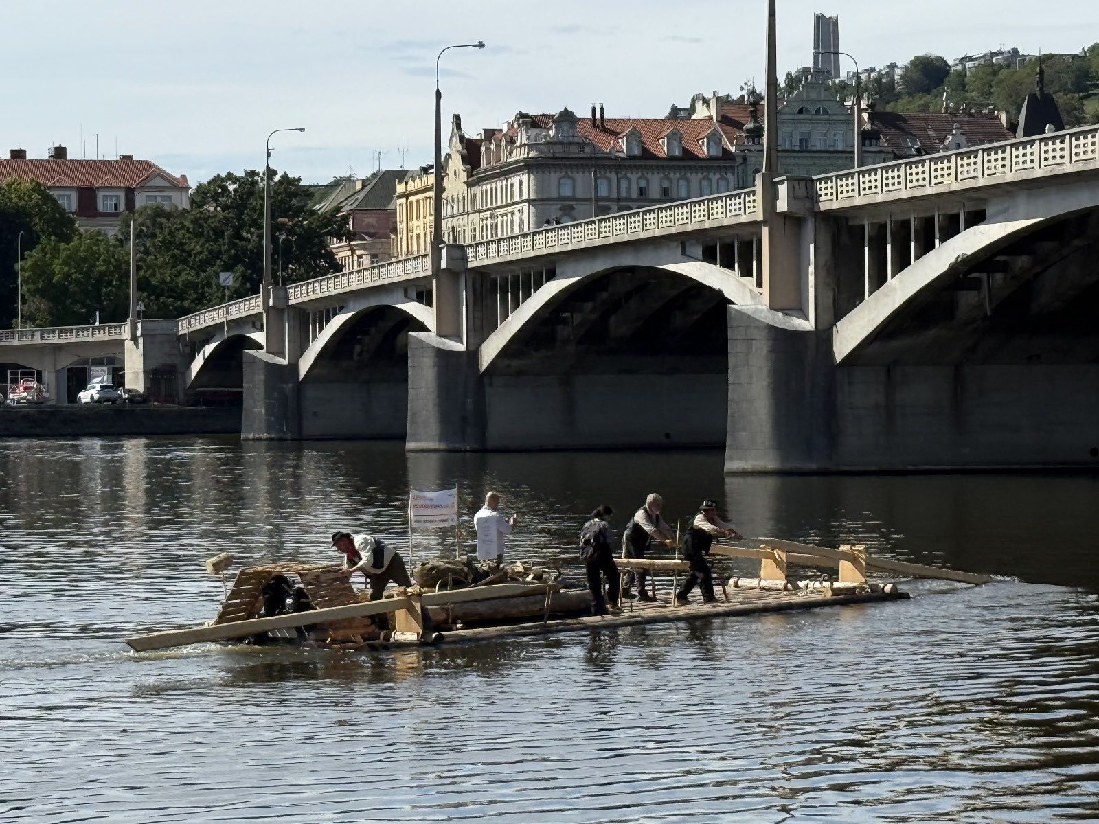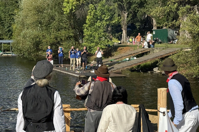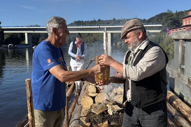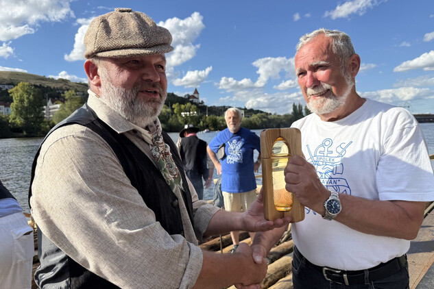 Trojice plavců z Purkarce, ve složení vrátný Jan Pöschl, Josef Nachlinger a Jan Pöschl na historické vorové tabuli ve čtvrtek 4. září dopravili z pražského veslařského klubu Bohemians TJ na Rašínovo nábřeží k bočnokolesovému parníku Vltava manželku prezidenta ČR Evu Pavlovou.