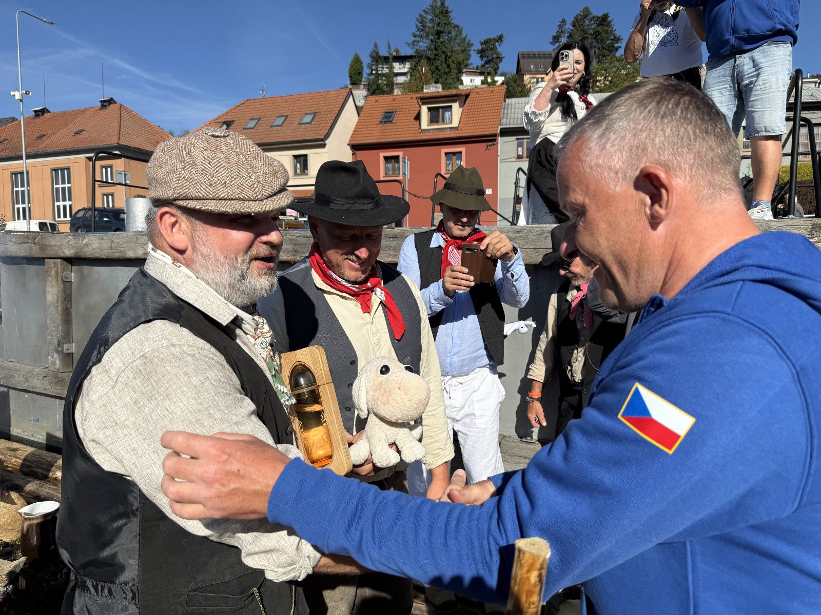 Na „Bohemce“ předal vrátný voru Jan Pöschl vodu z pramenů Vltavy předsedovi Vltavanu Praha Václavu Hodrovi, který ji druhý den v poledne svěřil do rukou Evy Pavlové.